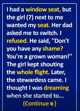 I had a window seat, but the girl (7) next to me started to cry because she wanted my seat. Her dad asked me to switch. I refused. He said, “Don’t you have any shame? You’re a grown woman!” The girl kept shouting the whole flight.