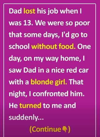 Dad lost his job at the bank when I was 13. We were so poor that some days, I’d go to school without food. One day, on my way home, I saw Dad in a really nice red car with a blonde girl beside him.