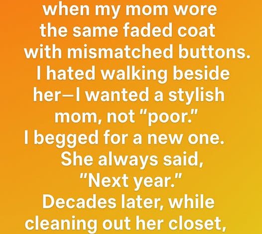 As a teen, I cringed every winter at my mom’s faded coat with mismatched buttons. I hated walking beside her—wanting a stylish mom, not one who looked “poor.” I begged for a new one; she always said, “Next year.”
