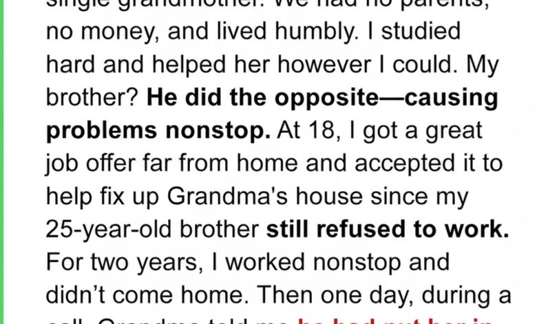 Raised by our single grandmother—no parents, no money—I studied hard and helped however I could. My older brother did the opposite: endless trouble. At 18, a great job offer came from far away. I took it to fix Grandma’s house, since 25-year-old brother still refused to work.