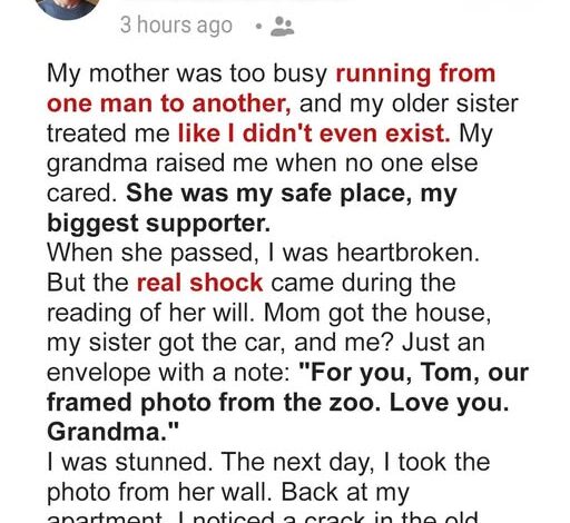 When Grandma Grace died, Mom took the house, my sister the car, and I got one framed photo: us at the zoo when I was six. Hurt, I almost discarded it—until a crack revealed an envelope with stock certificates, deeds, and a brass key: “For when you’re ready.”