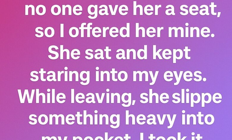 At her stop, she rose slowly, then slipped something into my coat pocket with a gentle smile, like sharing a secret. Surprised, I waited to check.