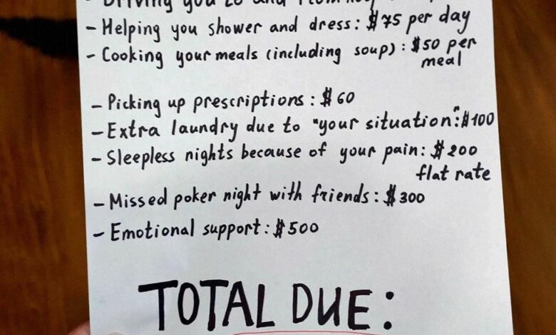 Three days after my hysterectomy, which ended our dreams of children due to complications, I found an itemized invoice taped to the fridge. My husband Daniel had billed me $2,105 for his “care”: $120 for hospital drives, $75/day for helping me shower, $50/meal for nine meals, $300 for missing poker night, $500 for emotional support.
