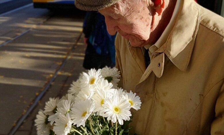 At the stop, elderly John—hunched in oversized coat, clutching daisies—frantically patted pockets. Wallet forgotten. Bus hissed open. Driver: “Pay or off.” John pleaded: meeting someone important. Passengers groaned.