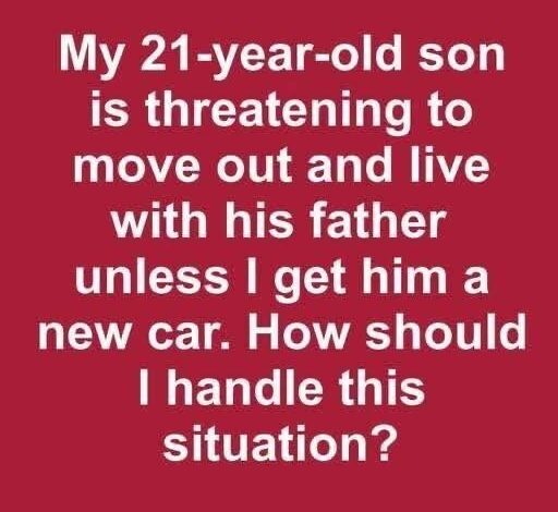 A 21-year-old son told his single mother: “Buy me a new car or I’m moving in with Dad.”