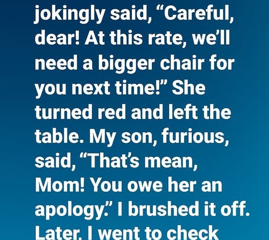 As my daughter-in-law reached for a second slice of pie, I joked, “Careful, dear! At this rate we’ll need a bigger chair for you next time!” She went red and left the table. My son immediately said, “That’s mean, Mom. You owe her an apology.” I brushed it off—until I went to check on her.