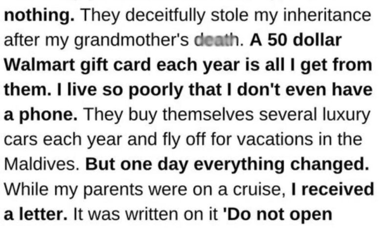 When my parents lived in luxury, I was scraping by with nothing—no phone, no savings, no security. They stole my inheritance after my grandmother died, leaving me with nothing but a $50 Walmart gift card each year. Meanwhile, they bought luxury cars, took Maldives vacations, and acted like I didn’t exist.