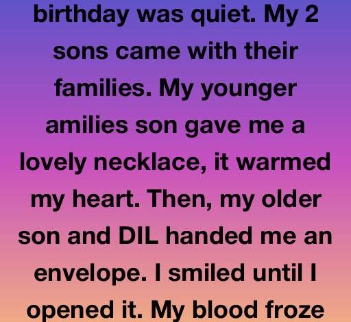 I turned 70 quietly in my little New Hampshire home. After losing my husband, Richard, five years ago, I cherished peace, my garden, and the rare days when my sons visited. Peter, my younger son—a gentle teacher—came early with his wife and kids, helping with everything. His gift was a simple sapphire necklace I knew he’d bought with sacrifice. It warmed my heart.