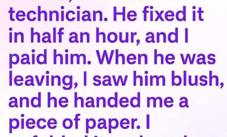 The washing machine leaked, so I called a technician. He fixed it in half an hour, took the payment, then hesitated at the door. Blushing, he handed me a note.