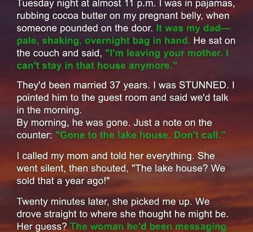 We tracked him to a house she recognized from years ago. His car was there. Inside, soft music played. My dad appeared, startled — and behind him stood the woman he’d been messaging.