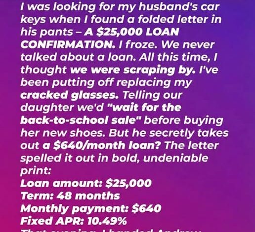 So when I found a loan confirmation for $25,000 in Grant’s pocket, my stomach dropped. We debated ten-dollar purchases, yet he’d taken out a massive loan without telling me.