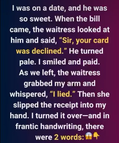 As I sat across from him, his charming smile and gentle words had made the evening feel like a scene from a romantic movie. The candlelight flickered, casting a warm glow over our table, and I found myself lost in the moment. When the bill arrived, the waitress’s comment—“Sir, your card was declined”—shattered the illusion. His face drained of color, and I stepped in, paying with a reassuring smile, hoping to salvage the night. He mumbled thanks, and we prepared to leave, the awkwardness hanging between us.