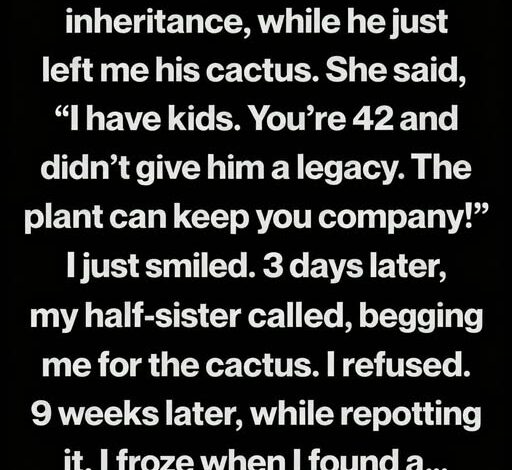 When my father passed away, grief didn’t crash over me—it settled quietly into daily life. At the will reading, my half-sister inherited the house, savings, and everything of clear value. I received one thing: his old cactus, the same plant that had sat by his window for years. She laughed, saying she had children to support and that I, at 42, would be fine with something small. I didn’t argue. I took the cactus home and placed it on my kitchen table, choosing to see it as a final, quiet gift from a man who never spoke easily.