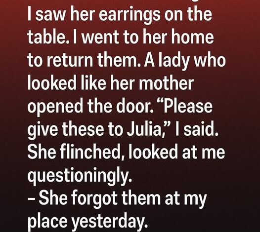 She invited him inside. Calmly, she turned the earrings in her palm and said Julia hadn’t been home in years. The house was neat, preserved, filled with photographs that stopped at the same moment in time. Slowly, understanding settled in.