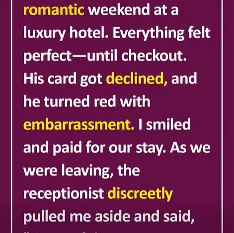My boyfriend planned a romantic weekend at a luxury hotel. Everything felt perfect—until checkout. His card got declined, and he turned red with embarrassment. I smiled and paid for our stay.