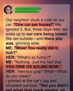 A few days later, before sunrise, the sound of tow trucks jolted us awake. Both our cars were being lifted. Across the street, Lindsey sipped her coffee calmly, as if this were routine. The tow truck driver explained the request had come from the homeowners’ association earlier that morning. One of our vehicles carried a sticker tied to specialized work, meaning towing it without verification could result in severe penalties.