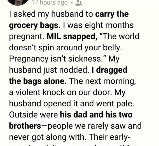 At eight months pregnant, carrying groceries up our apartment stairs felt like climbing a mountain. My back burned, my feet throbbed, and the plastic bags cut into my hands. I asked my husband for help—quietly, reasonably. Before he could answer, my mother-in-law’s voice sliced through the room.