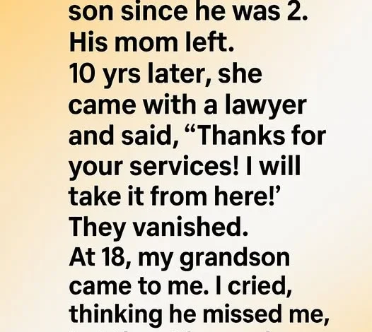 I raised my grandson since he was 2. His mom left, and for ten years, he and I built a life together—scraped knees, bedtime stories, school projects, and quiet afternoons. Then, out of nowhere, she returned with a lawyer and said, “Thanks for your services. I’ll take it from here.” They vanished, leaving me holding memories and an empty house.