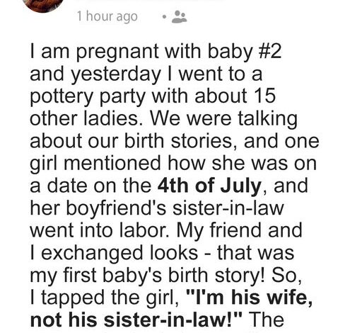 I’m pregnant with baby #2, and yesterday at a pottery party with 15 ladies, we shared birth stories. One woman said she was on a 4th of July date when her boyfriend’s sister-in-law went into labor. My friend and I glanced knowingly—that was my first baby’s story! Laughing, I tapped her: “I’m his wife, not sister-in-law!” She deadpanned, “But he’s not married.”