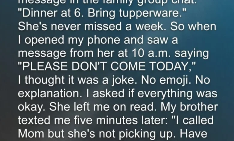 She hadn’t been sick or hurt. She was simply overwhelmed. Hosting Sunday dinner had always been her joy, but that morning it felt too heavy. She didn’t want to disappoint us, so she sent the shortest message she could and hoped we’d understand.