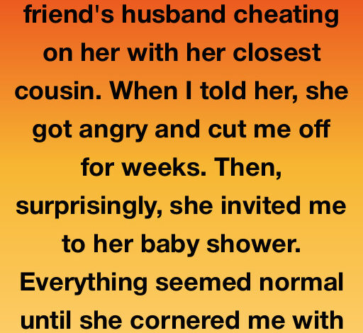 I caught my pregnant friend Sadie’s husband, Bryan, cheating with her cousin Marla. When I told Sadie, she was furious and cut me off. Weeks later, she invited me to her baby shower, where she and Marla confronted me. I reiterated seeing them kiss at a hotel. Marla denied it, but Sadie, exhausted, asked her to leave. Alone, Sadie admitted she’d checked Bryan’s phone and found recurring hotel charges, confirming my story. She invited me to test my loyalty and revealed a plan.