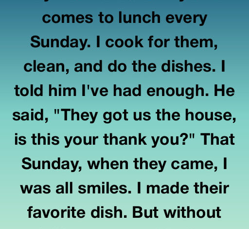 For three years, I cooked, cleaned, and washed dishes for my husband’s family of eight every Sunday lunch. Exhausted, I told him I’d had enough. He countered, “They got us the house, is this your thank you?” The next Sunday, I made just enough of their favorite dish for them, none for me. When they noticed I wasn’t eating, I calmly said it was all for them. The awkwardness hit when the food ran out. My husband was embarrassed but didn’t grasp my point.