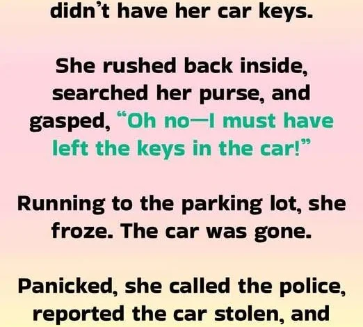 “Honey,” she stammered, “the car’s been stolen. I left the keys inside!”