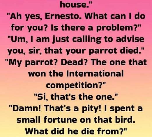 “Señor, this is Ernesto, the caretaker at your country house. I’m sorry to say… your parrot has died.”
