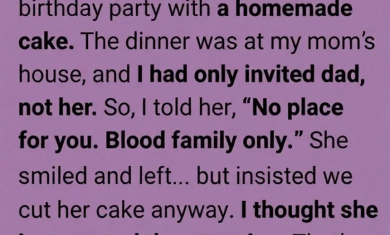 My stepmother showed up to my birthday dinner with a homemade cake I hadn’t asked for. The party was at my mom’s house, and I had invited only my dad. Trying to avoid old tensions, I told her, as gently as I could, that tonight was just for immediate family.