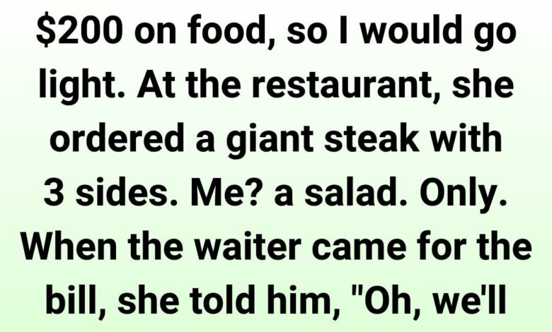 At the restaurant, she went all out — a huge steak with three sides. I stuck to a simple salad. When the waiter brought the check, she casually said, “We’ll just split it.”