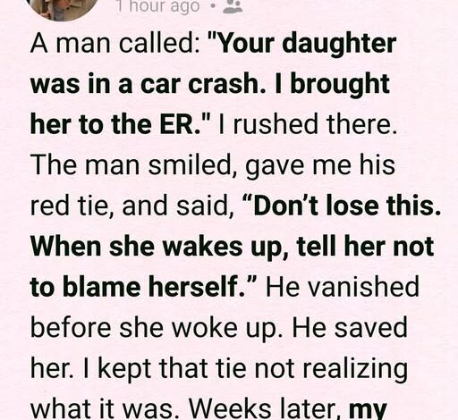 In the hallway, I met a man—pale, dirt-streaked, with blood on his sleeve. “I pulled her out before the car caught fire,” he said quietly. Before leaving, he handed me a torn red tie. “When she wakes up, tell her she did the right thing,” he said. “Tell her not to blame herself.”