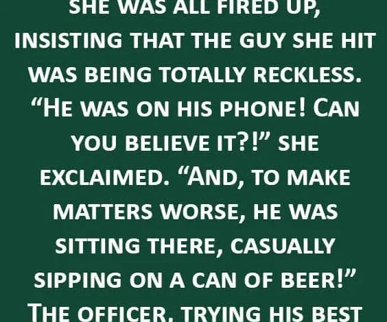 My wife managed to crash the car again today. When the police arrived, she was already fired up, pacing near the dented bumper. “That guy was totally reckless!” she said, pointing. “He was on his phone — and drinking a beer like nothing happened!”