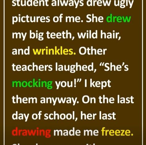 I teach 3rd grade. One of my students always drew pictures of me—big teeth, wild hair, wrinkles. Other teachers joked, “She’s mocking you!” I laughed it off, but something told me to keep every single one.