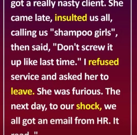 I’m Shiloh, 30, working in a busy beauty salon. A few days ago, a client arrived 25 minutes late, threw her jacket down, called junior staff “shampoo girls,” and told me, “Don’t screw it up like always.” I calmly refused service and asked her to return when she could be respectful. She left angry — I thought that was the end.