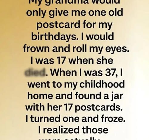 When I was young, my grandma gave me a single postcard for each birthday, which I found disappointing compared to other kids’ gifts. At 17, she passed away. Twenty years later, at 37, I found a jar in my childhood home’s attic containing those 17 postcards. Initially, I smiled at the memory, but then I noticed something extraordinary.
