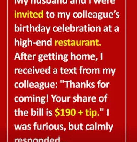 My husband and I attended a colleague’s birthday dinner at a high-end restaurant. The next day, she texted: “Your share is $190 + tip.”