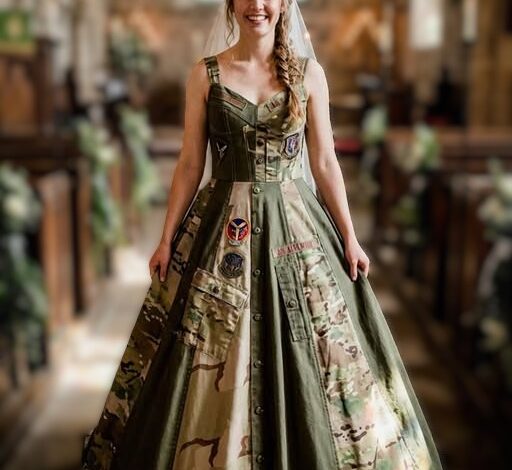 When the church doors opened, my fiancée Clara wasn’t wearing white—she walked in wearing a wedding dress made from her late father’s old army shirts. The room fell silent as she explained he couldn’t be there, so she made sure he still walked her down the aisle.