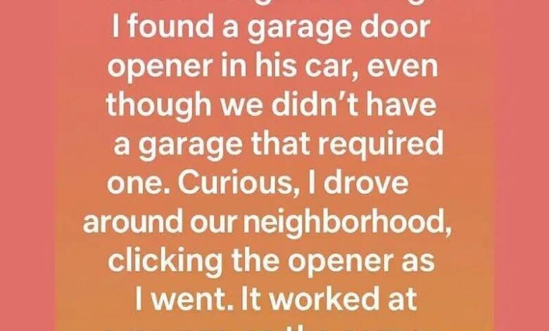 The sudden death of my husband left a silence nothing could fill. Weeks later, I found a garage opener among his things—strange, since we didn’t own a garage. Curious and uneasy, I walked through the neighborhood, pressing the button as I passed by different doors.