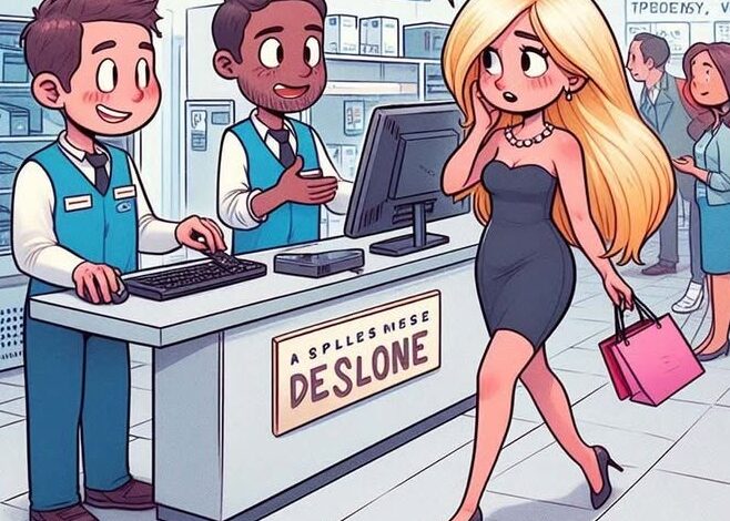 A blonde walks into an appliance store and points to a TV.