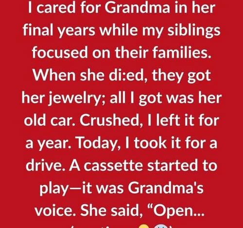 I cared for Grandma in her final years while my siblings prioritized their families. When she passed, they inherited her jewelry; I got her old car. Devastated, I left it untouched for a year. Then, driving it, a cassette played Grandma’s voice, directing me to the glovebox. Inside, an envelope with a key and a note led me to her garden shed.