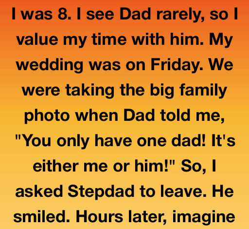 When my biological dad, who rarely visited, demanded I choose between him and my stepdad, Marc, at my wedding, I panicked and asked Marc to leave the family photo. Marc, who raised me since I was eight, smiled and quietly left—not just the photo, but the wedding entirely. He drove off without a word, leaving me with guilt that overshadowed the celebration. I’d chosen my absent dad’s approval over the man who’d always been there—school plays, soccer games, hospital trips.
