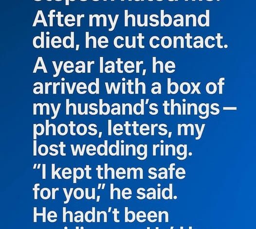 A year later, he appeared at my door with a weathered cardboard box, saying, “I kept them safe for you.” Inside were my husband’s belongings—postcards, photos, love letters, and my lost wedding ring, which I thought was gone forever. As I sifted through memories, he explained his silence. He hadn’t been angry or indifferent. Grieving, he’d found his father’s private struggles and chose silence to spare me more pain, believing it would help me heal. His distance was love, misunderstood, a young man’s attempt to protect me while carrying his own burden.