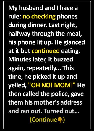 Husband and I have a rule: no checking our phones during dinner. Last night, halfway through the meal, his phone lit up. He glanced at it, but continued eating. Five minutes later, it buzzed again, repeatedly. This time, he picked it up and yelled, “OH NO! MOM!”