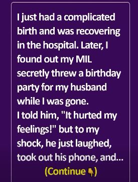 “I just had a complicated birth and was recovering in the hospital. Later, I found out my MIL secretly threw a birthday party for my husband while I was gone.