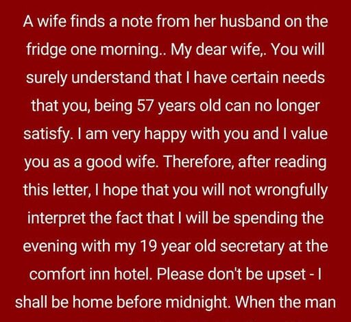 Wife’s Note on Dining Table (When He Returns Late): My dear husband, I received your letter and thank you for your honesty about me being 57 years old. I would like to take this opportunity to remind you that you are also 57 years old. As you know, I am a maths teacher at our local college. I would like to inform you that while you read this, I will be at the Hotel Fiesta with Michael, one of my students, who is also the assistant tennis coach. He is young, virile and, like your secretary, is 19 years old. As a successful businessman who has an excellent knowledge of maths, you will understand that we are in the same situation, although with one small difference – 19 goes into 57 more times than 57 goes into 19. Therefore, I will not be home until sometime tomorrow.