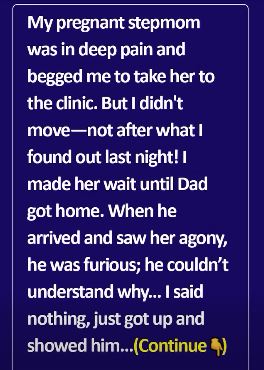 This morning, my pregnant stepmom, in deep pain, begged me to take her to the clinic. But I didn’t move—not after what I found out last night! I made her wait until Dad got home. When he arrived and saw her agony, he was furious; he couldn’t understand why…